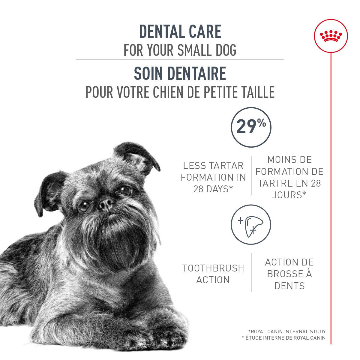 Some dogs are more prone to dental tartar buildup. After meals, food residue forms a thin layer of plaque covering the teeth. Over time, this plaque calcifies into tartar, which accelerates the accumulation of bacteria which can have health consequences. Complete nutrition delivered in kibble form formulated with a specialized texture that polishes your dog's teeth during chewing. This, along with chewing, helps limit the buildup of plaque and tartar with each meal. Maintaining good oral hygiene is essential for your dog's overall health. How else can you help your dog It is recommended to brush your dog's teeth daily. Use toothpaste designed specifically for dogs and an appropriately sized toothbrush. If you have any questions or concerns regarding your dog's health, please consult your veterinarian.