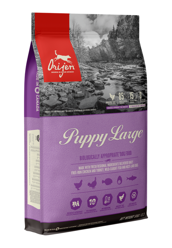 Aidez votre chiot à s’épanouir grâce à nos puissantes recettes riches en protéines, pour une alimentation optimale. Tous les chiots de grande race se portent mieux quand ils ont un régime biologiquement approprié riche en protéines et en matières grasses provenant d’ingrédients d’origine animale de qualité pour favoriser un développement optimal. Le régime ORIJENMD Chiot grande race regorge de 85%1 d’ingrédients d’origine animale de qualité comme du poulet et de la dinde élevés en liberté2 et du poisson capturé à l’état sauvage ou d’élevage durable frais ou crus3. Regorgeant d’ingrédients WholePrey d’origine animale comme des organes, des arêtes et des os, les nourritures ORIJEN contiennent les parties les plus succulentes et riches en nutriments de la proie, pour offrir aux chiots la nutrition dont ils ont besoin. Grâce à tout cela, votre compagnon canin bénéficie d’un régime sans égal.