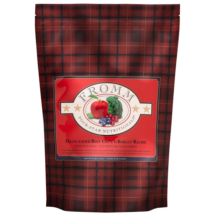 La nourriture Fromm Four-Star Recette de Highlander Beef, Oats, ‘n BarleyMD pour chiens est une recette d'inspiration écossaise de bœuf, d'avoine entière, d'orge à grains entiers et d'un assortiment de fruits et légumes. Ce mélange distinctif est spécialement préparé pour assurer la cohérence, la qualité et le goût supérieur à chaque bouchée. La Recette de Highlander Beef, Oats, ‘n BarleyMD procure une nutrition complète et équilibrée aux chiens de tous âges et peut être servie en alternance avec les autres recettes Fromm Four-Star.