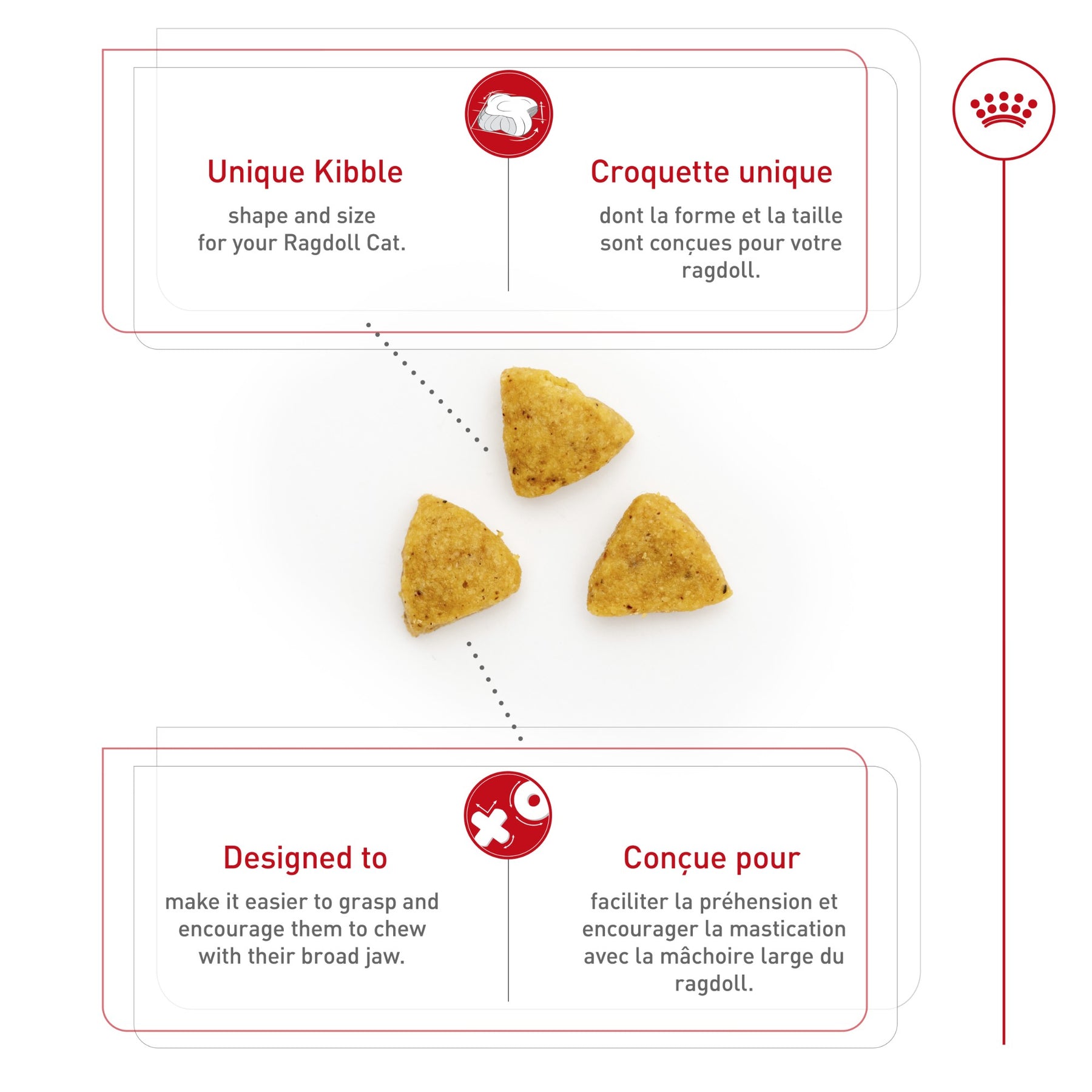 Le ragdoll est l’une des plus grandes races de chats. Un régime alimentaire équilibré et des rations alimentaires appropriées soutiennent son physique musclé à l’ossature forte et contribuent au maintien d’un poids idéal. La formule RAGDOLL favorise la santé des os et des articulations. Celle-ci est enrichie d’acides gras oméga-3, de glucosamine et de chondroïtine.
